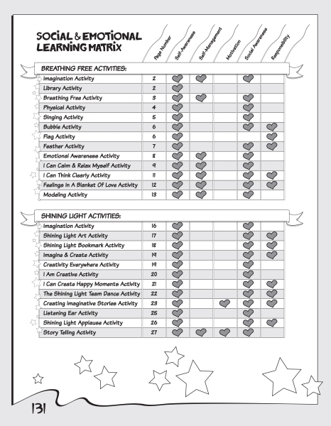 The Social and Emotional Learning Matrix, (see image) a component of the Beaming Bright, You’re a Shining Light Lesson Plans, offers all users a quick reference to view all the social and emotional learning concepts contained in each of the 101 activities.